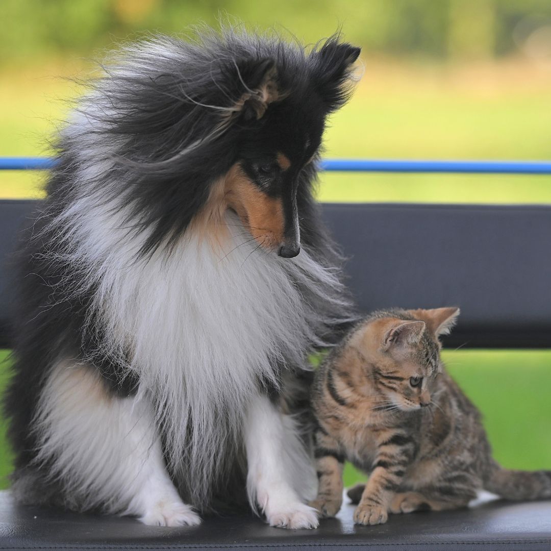 Pets are constantly communicating through body language, and it’s important to pay attention. Watch your dog for high tension or “hyper-focus” and your cat for crouching. If anyone seems overwhelmed, end the session and try again the next day. Short, positive interactions are much better than one long, stressful one.